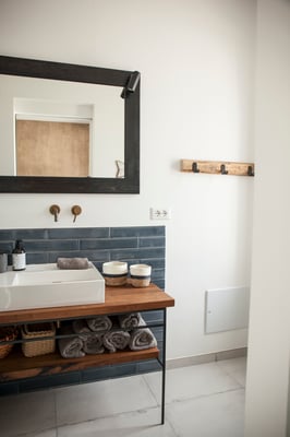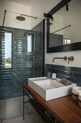 Passend und ensuite ist das Masterbad in nero carubbe mit bodengleicher Regendusche und schönen Eiche Elementen. WC, Bidet und selbst designte Handtuchhalter vervollständigen diesen Raum. 2 Fenster sorgen für viel Helligkeit. Durch das Nordfenster seht Ihr das Meer während ihr duscht.