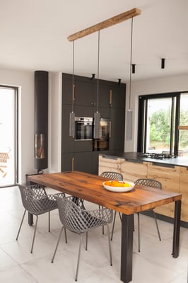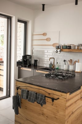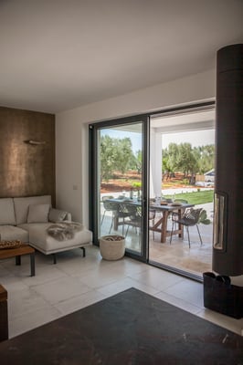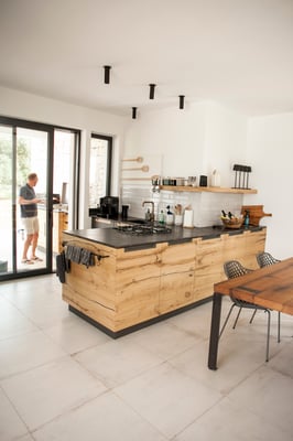 Ein lichtdurchfluteter Raum mit 2 großen Schiebetüren und verglaster Eingangstür lassen Licht und Natur in den Wohnbereich. Hier treffen rustikale Eiche, Stahl, Anthrazit und eine Quarzit Arbeitsfläche aus braunschwarzem Brecchia Imperiale aufeinander und werden mit bequemen Sofa und Stühlen ein Rückzugsort an heißen Sommertagen oder kühlen Herbstabenden.