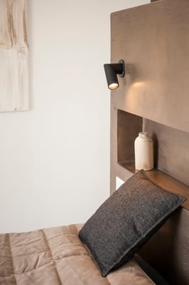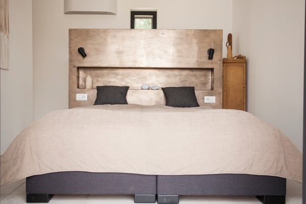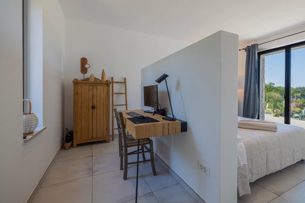 Zwei Boxspringbetten sind eingerückt zwischen maßgefertigten Schränken. Die Abmauerung an der Wand dient als Ablage für Bücher, Brillen und Gläser. Sie hat den Vorteil, dass die Anordnung der Betten frei gestaltet werden kann, je nachdem ob man Einzelbetten oder ein Doppelbett benötigt. Der Ausgang durch die Terrassentür Richtung Nord leitet dich direkt auf die Poolterrasse. Einen schnelleren Weg vom Bett zum Wasser gibt es nicht.