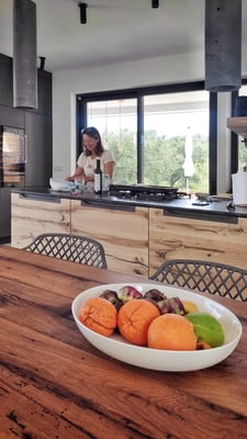 Unsere Küche wurde von uns entworfen und ein Schreiner aus dem Nachbarort hat unsere Ideen und Vorgaben perfekt umgesetzt. In den Schränken verbirgt sich neben zweierlei hochwertigem Geschirr, ausreichend Gläsern und Küchenausstattung genug Stauraum für die eigenen Einkäufe. Die Insel ist perfekt für einen gemeinsamen Schnippel und Kochabend.