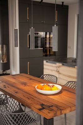 Wir lieben es unsere Esstische bauen zu lassen. Der Hamburger Tischler hat uns aus 300 Jahre alter Eiche eine 8 cm dicke Platte gefertigt, die ca 110 kg wiegt. Hier finden bis zu 8 Personen Platz.
