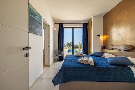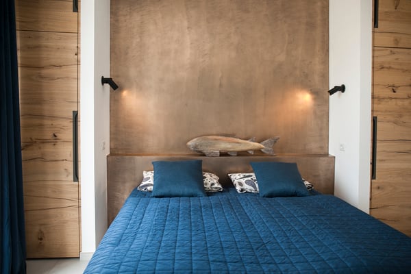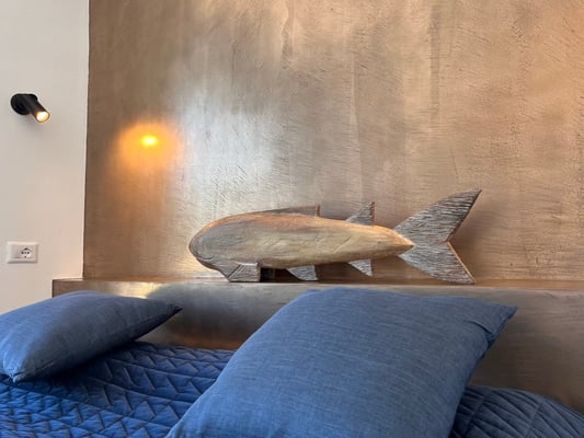 Blue Notte - Nachtblau ist der Himmel, wenn die einheimischen Fischer auf Tintenfisch Fang gehen. Diese Farben der dunklen Nacht und des Meeres sind die Elemente unseres zweiten Schlafzimmers im Haupthaus.