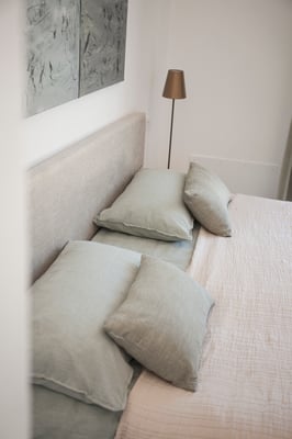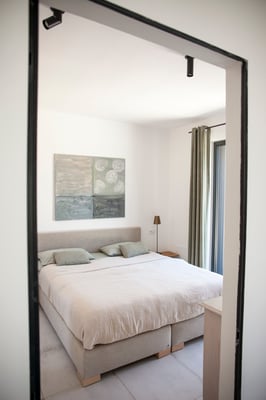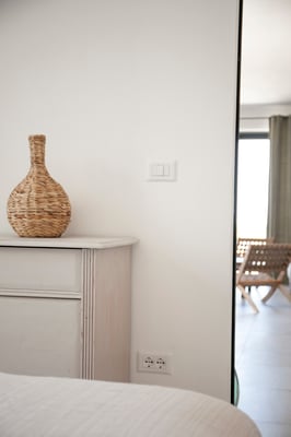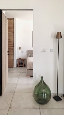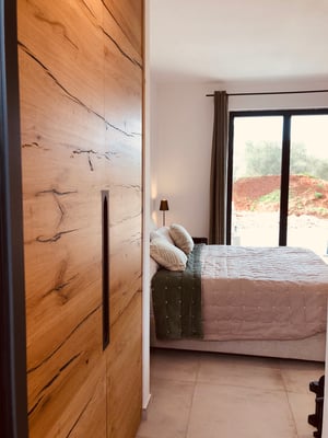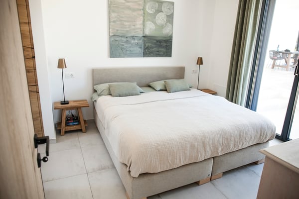Wir lieben den Blick in die Natur und die Helligkeit Apuliens, daher haben wir diesen Schlafbereich offen gestaltet und mit dem Bad kombiniert. Ein Boxspringbett mit 1,80m Breite ermöglicht durch die große Terrassentür den Blick auf den Pool. Schaut man durch den Badbereich , sieht man in den Olivenhain und die Morgensonne.