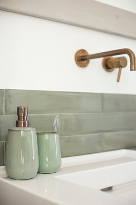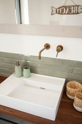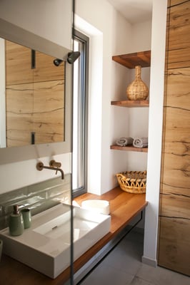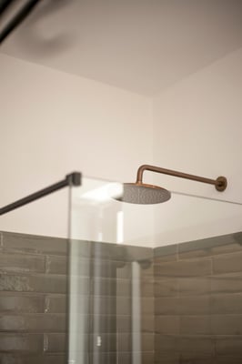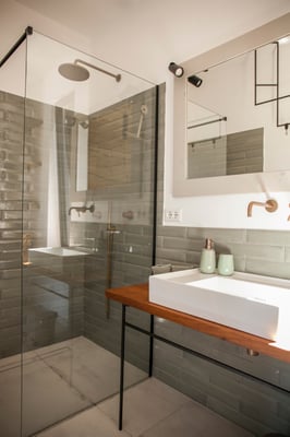Ein großer Einbauschrank und eine antike Kommode in gekalkter Optik sorgen für genügen Stauraum. Passend und ensuite ist das offen Bad in aqua verde- auch hier mit bodengleicher Regendusche und schönen Eiche Elementen in Form des Waschtisches und integrierter Regale. Das WC mit Bidet befindet sich in einem separaten Raum mit Fenster Richtung Osten.