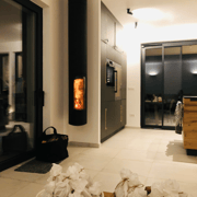 Esstische - je nach Sonnen/Schattenwunsch, einen von der Decke hängenden Focus Outdoor- Kamin, diverse Sitzbereiche, und tolle Dachterrassen. Die Krönung ist der 54 qm große und beheizbare