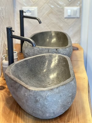 Der große Küchen Essbereich ist lichtdurchflutet. Ein Focus Kamin spendet in den kalten Monaten angenehme Wärme. Designerlampen und ein tolles Lichtkonzept erleuchten die Räume. Der alte Walnussbaum aus Schwiegerpapas Garten in Bayern bildet die Waschtische in den Bädern.